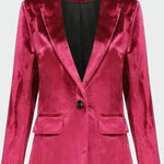 Impresiven sakot z žametno teksturo, ki prinaša razkošje in eleganco v vsakem videzu. Klasičen ovratnik v kombinaciji z enim gumbom na sprednjem delu ustvarja ravnotežje med brezčasnim in sodobnim stilom. Idealno za večerne izhode ali posebne priložnosti.