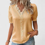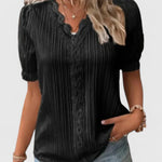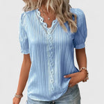 Pritegnite poglede to poletje s to brezskrbno elegantno bluzico z V-izrezom, ki združuje zračno udobje z subtilnimi, stilskimi detajli.