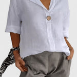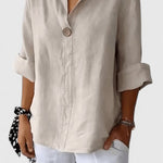 Ostanite hladni in samozavestni skozi celo poletje s to ohlapno V-izrezano bluzo z vozlom. Narejena iz zračnega bombažnega perila mešanice, ponuja popolno kombinacijo sproščenega udobja in vsakodnevne elegance.