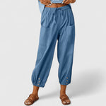 Vstopite v sproščeno sofisticiranost s temi hlačami širokih nogavic iz bombaža in lana, zasnovanimi za brezskrbno udobje in brezčasni stil.
