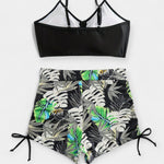 Bikini z visokim pasom in tropskim vzorcem ter naramnicami
