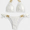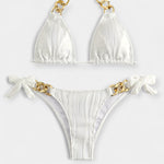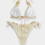 Moderen in privlačen, ta dvodelni bikini se navdušuje s svojo teksturirano črtasto tkanino in zlatimi detajli v obliki obroča in verige. Halter izrez in triangel zgornji del poudarja dekolte, medtem ko lok na strani dodaja igriv pomen – popoln za stilskega dne ob bazenu ali na plaži.