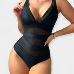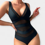 Ta eleganten enodelni kopalni kostum združuje ženstveno silhueto s pametnim oblikovanjem. V-izrez in prosojni detajli dodajajo seksi pomen, medtem ko tehnologija za nadzor trebuha nudi podporo in stabilnost za opazno bolj gladko linijo.