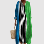 Ta osupljiva maxi obleka ima dramatičen črno-beli vertikalni črtasti panel, obdan z živahnimi zelenimi in modrimi bloki. Z njeno podaljšano silhueto in kontrastnimi rokavi ponuja brezskrbno ostrino in udobje čez ves dan v enem izstopajočem videzu.