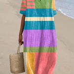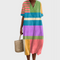 Ta midi obleka z barvnimi bloki je veselo praznovanje pastelnih nižjih in rdečih črt, ki ustvarjajo veselo in stilizirano silhueto. Njena zračna kroja in živahna paleta jo naredijo popolno izbiro za sproščene dni, sprehode po plaži ali ustvarjalna srečanja.