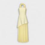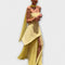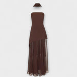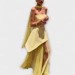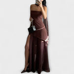 Ta osupljiva obleka brez naramnic ima strukturiran korzetno zgornji del v tekočem sloju šifona, kar je popolno za prefinjene priložnosti v posebnih trenutkih. Dolg, prosojen material omogoča graciozno gibanje, medtem ko stranski razporek ohranja njeno dinamično privlačnost.