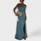 Ta osupljiva satenasta maksi obleka je utelešenje državnega glamurja in sofisticiranosti. Zasnovana z višjim razporkom , ki doda privlačnost z vsakim korakom, je ta obleka popolna za ustvarjanje vtisa na formalnih zabavah, porokah in nepozabnih večernih dogodkih.