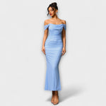 Stopite v središče pozornosti z našo osupljivo obleko z odkritimi rameni in naborki . Oblikovana za modne ženske, ta obleka ima eleganten morski rob in visok pas , ki lepo poudari vašo postavo.