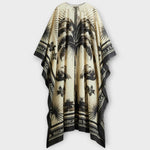 Dodajte pridih eleganci svojemu počitniškemu slogu z našo oversize kaftan obleko s flamingom, zasnovano za brezskrbno eleganco in udobje. Ta osupljiv kos ima igriv potisk flaminga in palme na šik svetlo bež in črni podlagi.