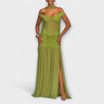 Izdelana iz luksuznega, raztegljivega slinky materiala v bogati olivno zeleni barvi , je popolnoma podložena za udobje in stil. Nizek V-oblika hrbta doda kanček senzualnosti, medtem ko gubanje in visok razporek lepo poudari vašo postavo.