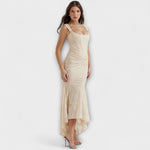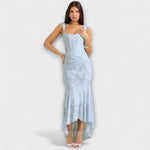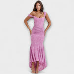 S korzetno zasnovo uživajte v popolnem prileganju, medtem ko čarobni naborki v pasu dodajajo pridih eleganco. Idealna za koktajle , večere ven ali katero koli praznovanje, je ta obleka zasnovana tako, da izstopate in ustvarite nepozaben vtis.