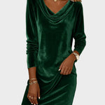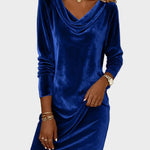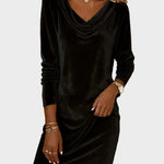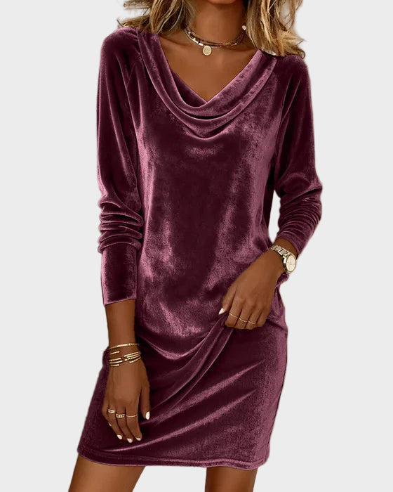 Obleka iz mehkega žameta z drapiranim izrezom, ki lepo poudari dekolte, ter dolgimi rokavi, ki optično podaljšajo postavo. Rahlo ohlapen kroj poskrbi za udobje, dolžina nad koleni pa doda moden in ženstven pridih. Popolna za večerje, posebne priložnosti ali večerne izhode, saj se z različnimi modnimi dodatki zlahka prilagodi vsakemu stilu.